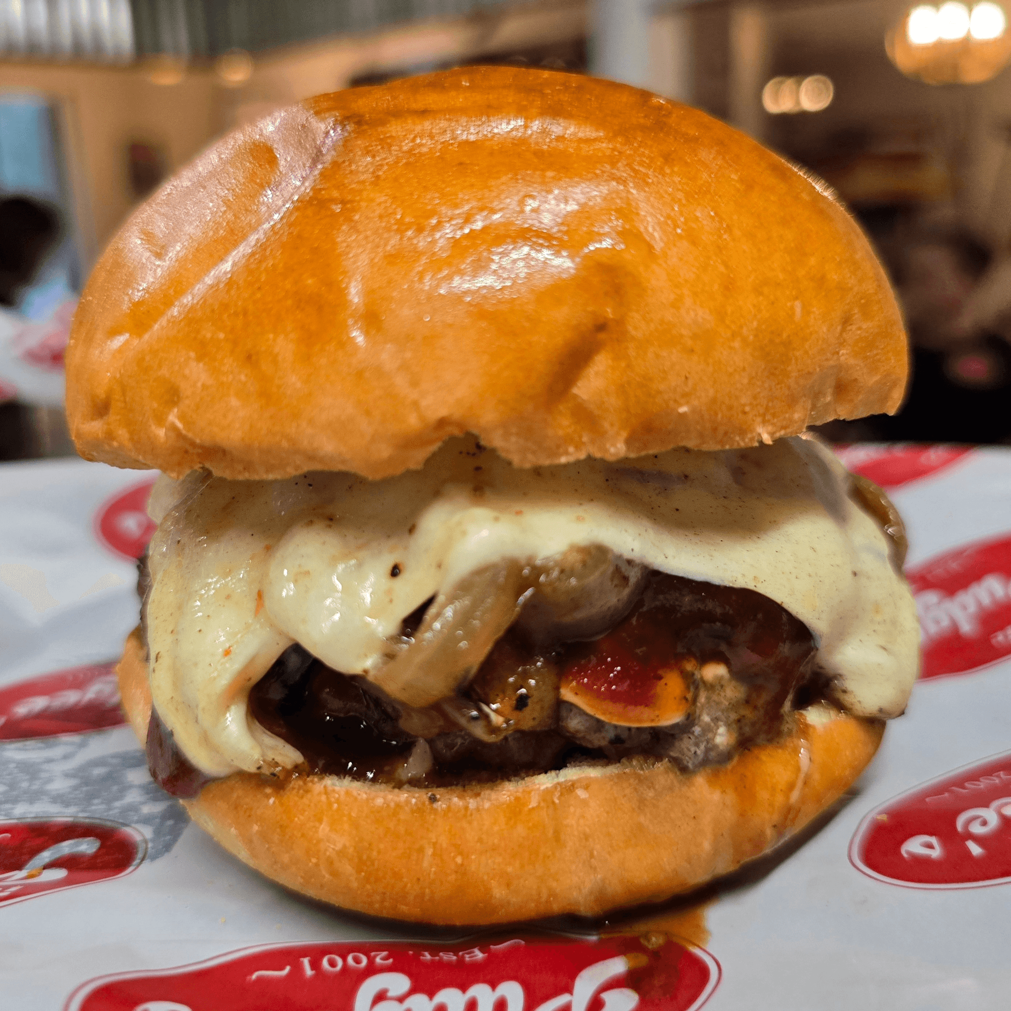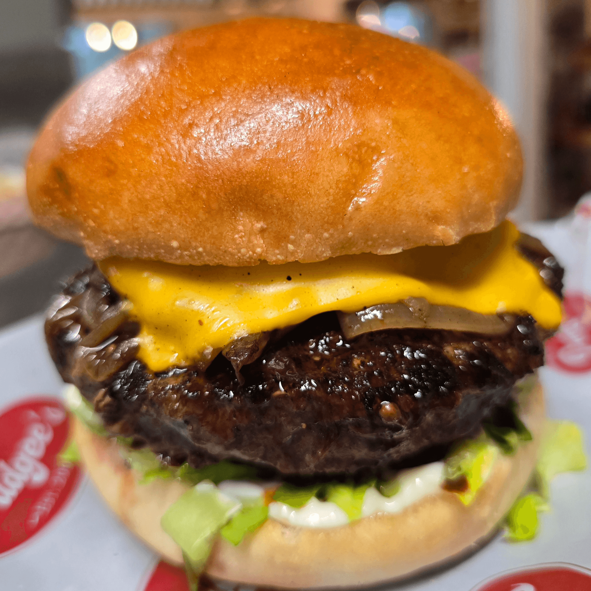 Our Signature Pudgee Patty topped with grilled onions, BBQ sauce, mayo & cheese