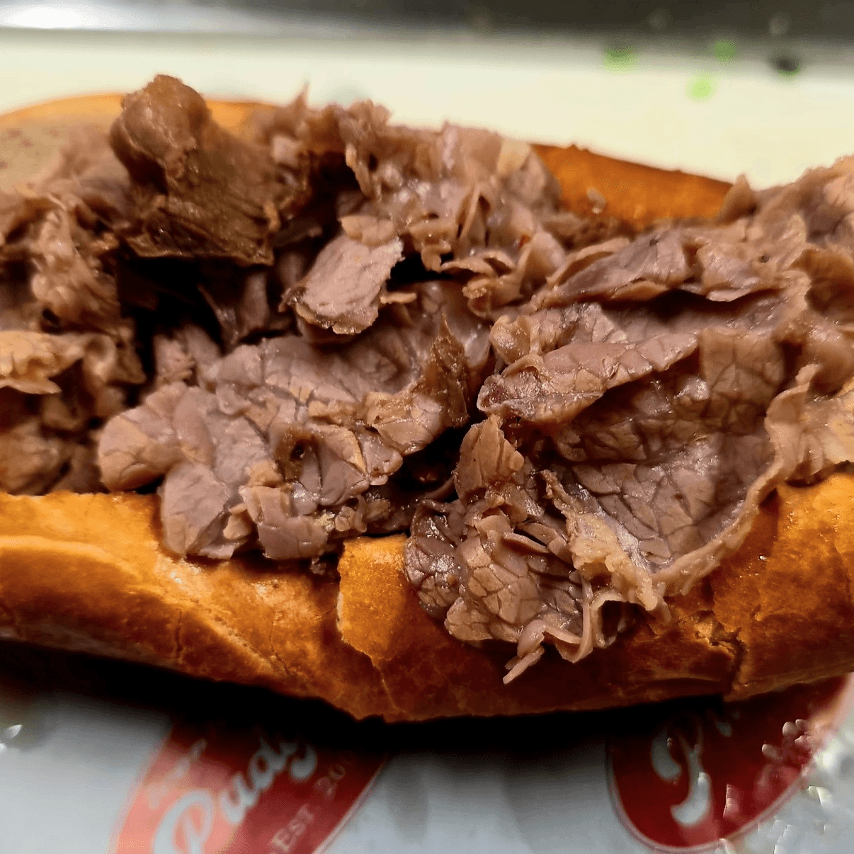 Juicy slim shaved beef, loaded on a toasted hoagie roll Try it wet!