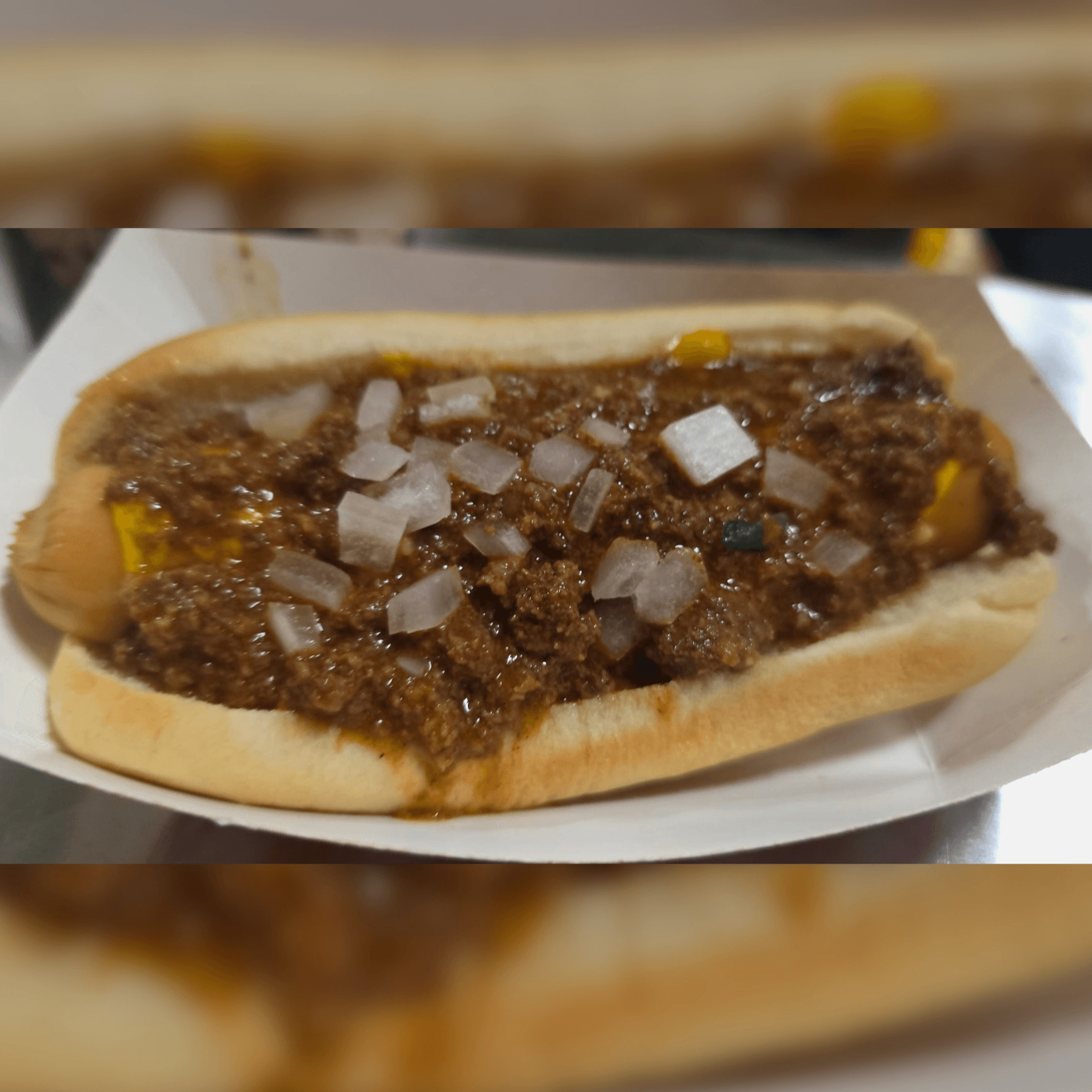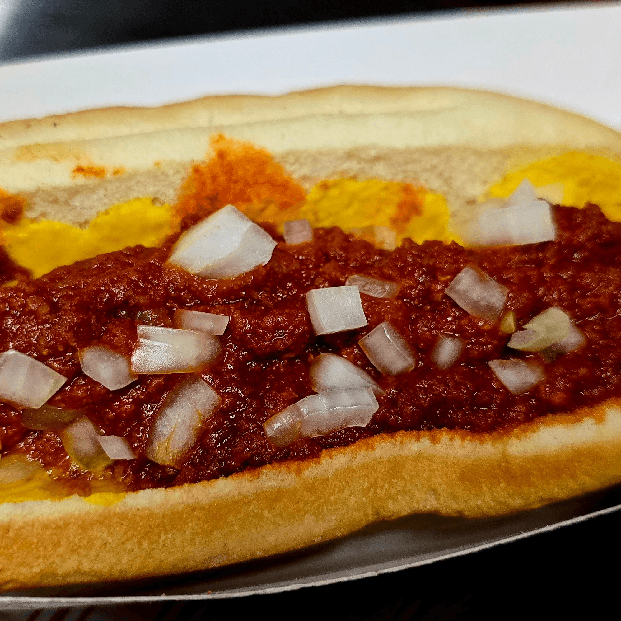 All meat Dog, authentic Greek meat sauce, onions & mustard