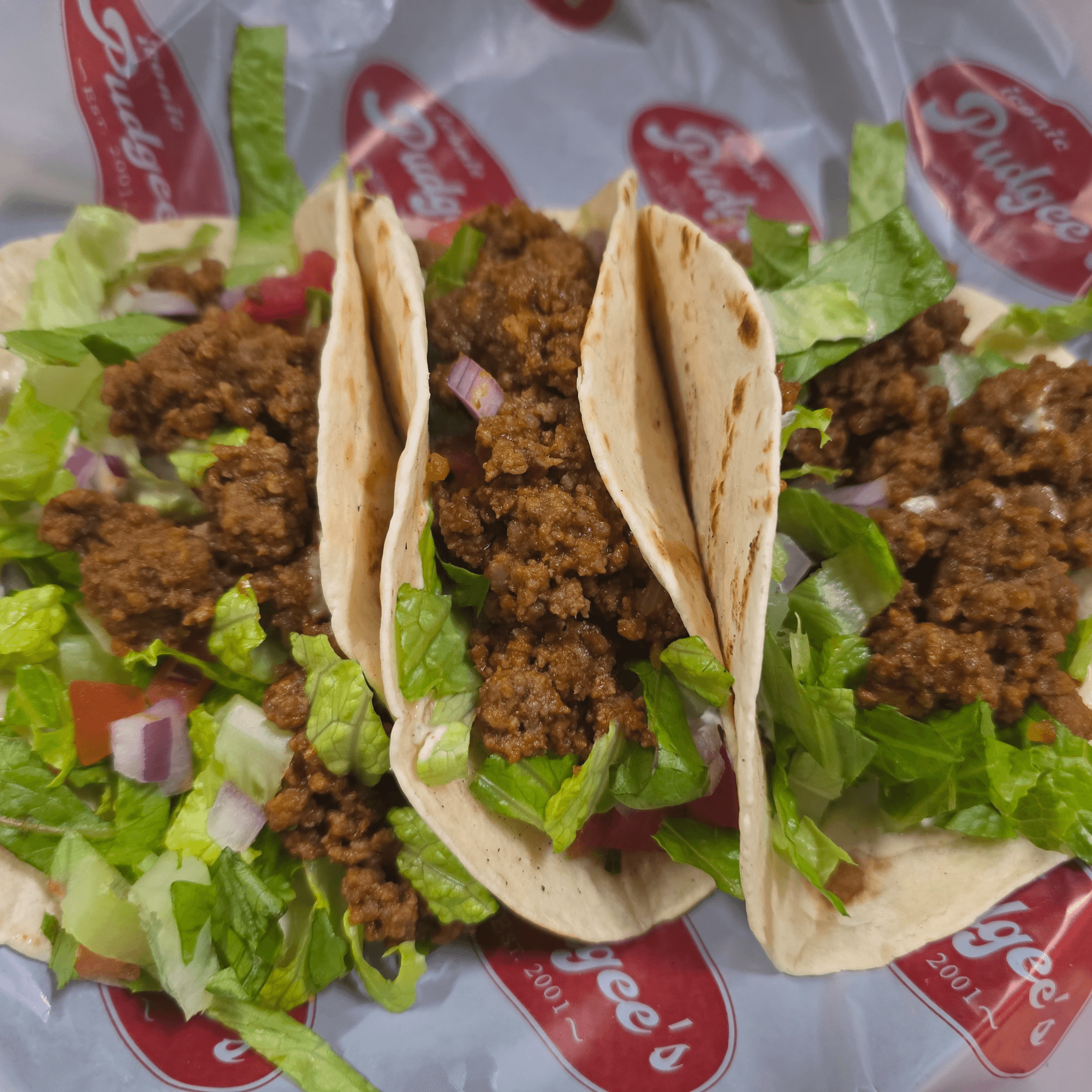 3 soft tortillas w/ seasoned ground beef, lettuce, tomato, onion & our Signature Mexican crema