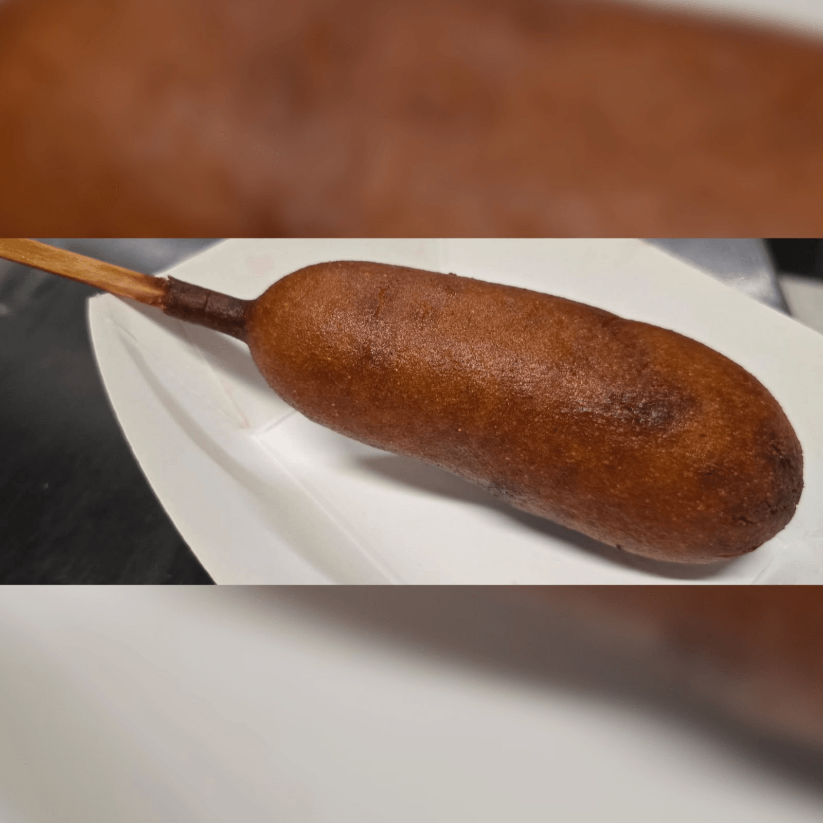 Our Classic Dog-On-A-Stick! Coated in cornmeal & deep fried!