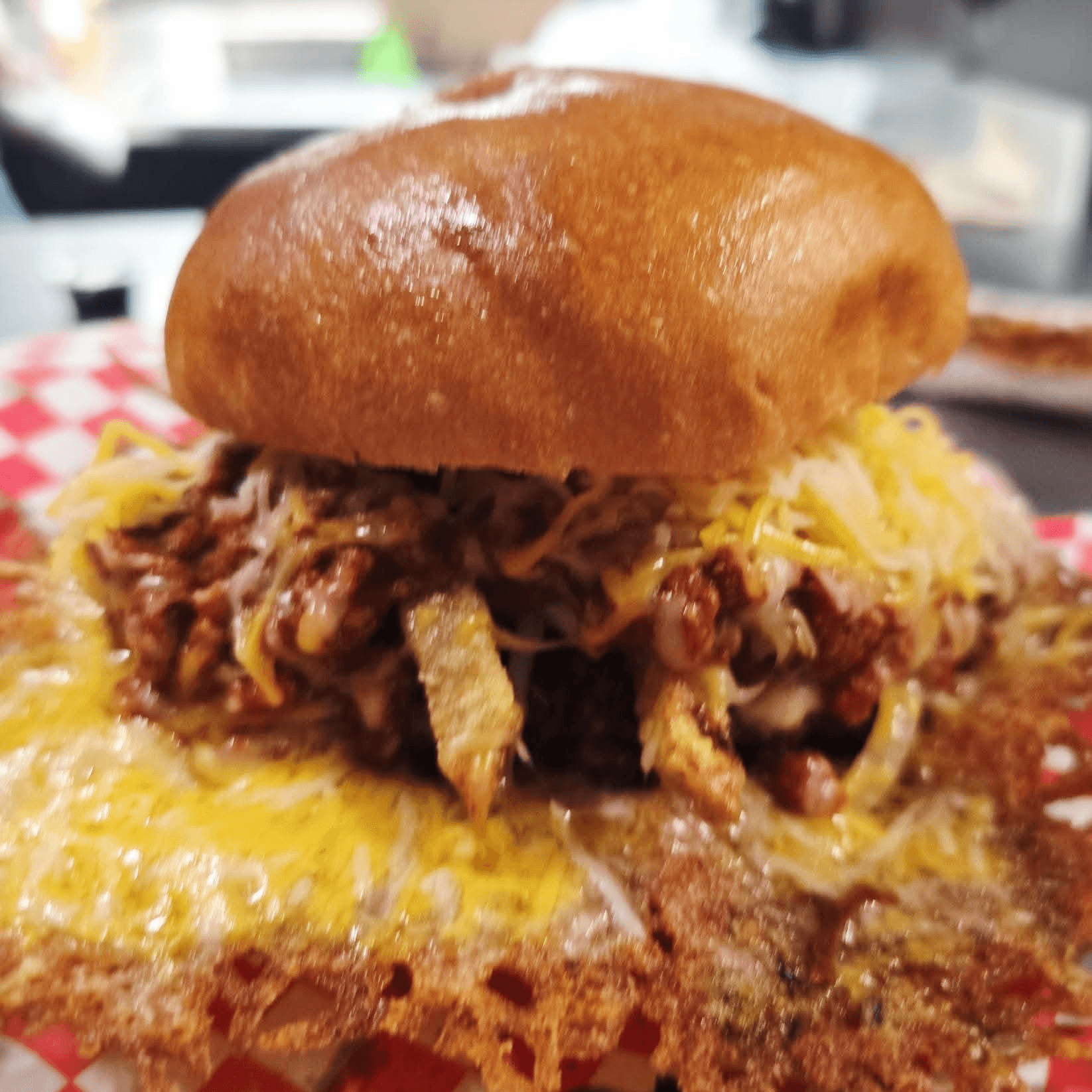 Our Signature Pudgee Patty topped with Fries, Signature Coney Meat Sauce, 2 cheeses, mustard & onions