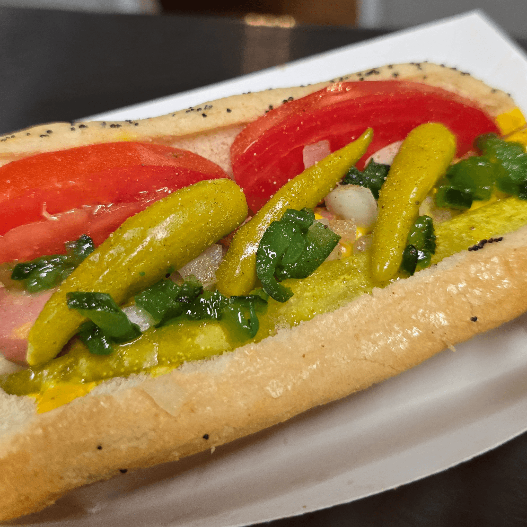 Original All Beef Vienna® Dog, mustard, relish, onion, tomato, sport peppers, pickles, celery salt .. on a poppy seed bun!