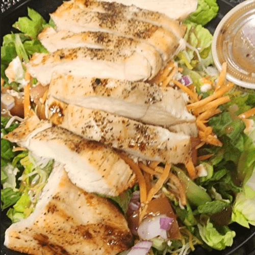 Juicy fresh grilled chicken breast on top of lettuce, tomatoes, onions & feta. Your choice of dressing.