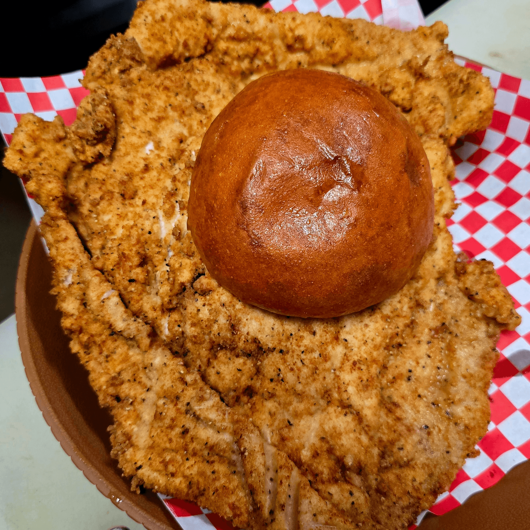 Fresh, hand-cut, hand-pounded then special seasoned and prepared to order with mayo, lettuce, tomato, onion & pickles, on a toasted bun.