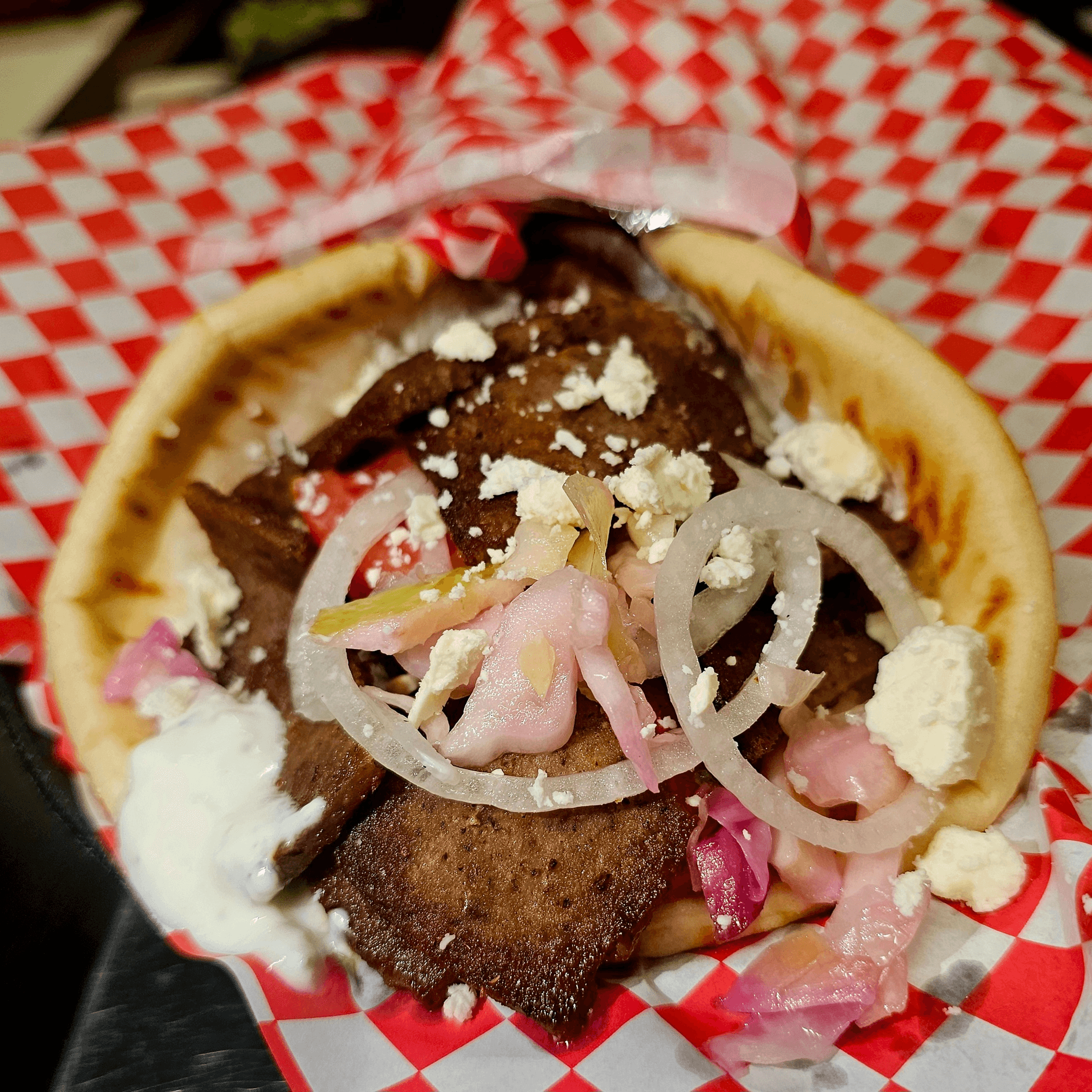 Gyro meat, our Signature pickled Greek slaw & home-made Tzatziki, onion, tomato, feta